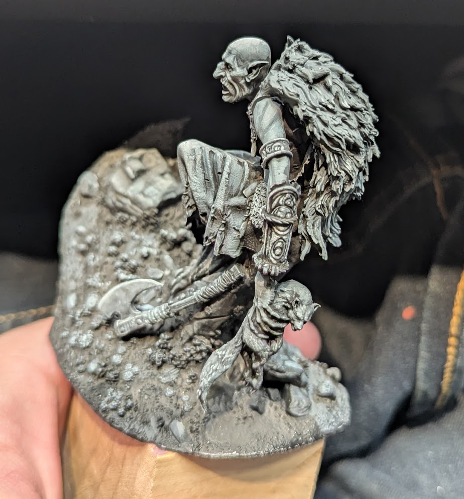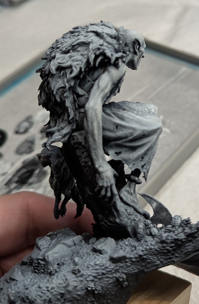 Day 1 of the class was spent learning the grisaille theory and application, and making the jump from how underpainting works for a Warhammer miniature to a large-scale miniature or a bust. This meant putting in more midtones and not having quite as sharp a jump between dark and light from my sketch. Because we had a full three days to work on the mini, we were able to paint the entire miniature. So I decided to paint my story: The light is striking Faolan in the face, and it has turned its face away from the light. The light bounce would then still illuminate all the details on the face and the body and weapon, but the biggest light bounces would be off the monster’s head and cloak. The day was spent mostly smoothing the blends from a blacked primed model to having white highlights, better rendering the sketches.
