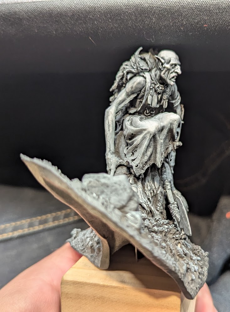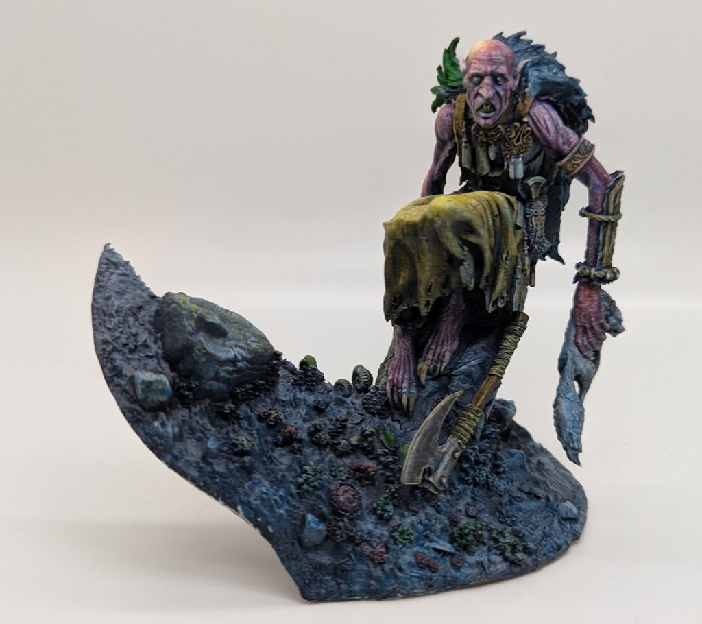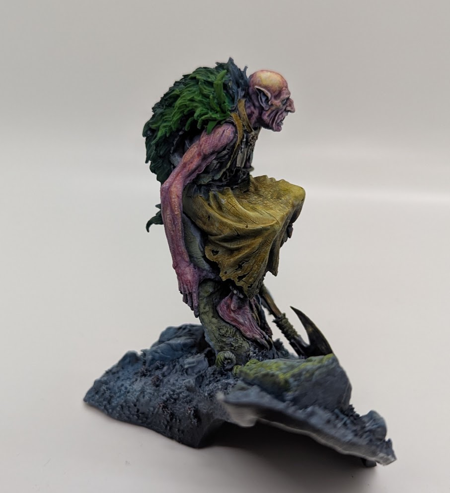 For me, the miniature depicts a cave dwelling monster who has existed in the darkness of a moist cave for all of it’s existence. It may have had another life once upon a time, but at this stage it does not remember anything except its ever-gnawing hunger and the darkness. Until one day, a shaft of natural sunlight shines through a hole in the cave, striking the monster in the face. The light would then reflect off the walls of the cave (and their wet, reflective surface), and then bounce back onto the monster.