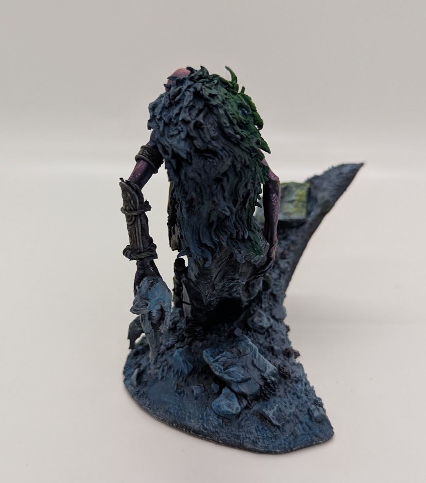 For the non-metallic metals, I used Basillicanum Grey as my local color. This mostly worked over the grasille, except on the axe where I went too opaque because time was starting to get short. Some of the other trinkets that I wanted to look metallic got a coloring of Snakebite Leather. The rocks and stones of the case were given a local color of Space Wolves Grey, and the fur cloak also got Space Wolves Grey because I was getting tired and I couldn’t figure out a different color with the paints that I had. I tried to distinguish the two with the grasille and the texture painted on each, and I think it worked. When I took it to Marco for review, he did some additional work on the cloak to differentiate it from the ground; and to push the blue up.