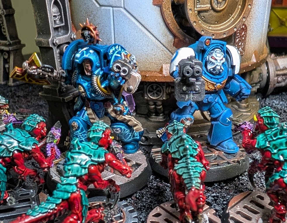 The gaming scenario here is Scenario 11: Battle Lines. While the Tyranid and Space Marine deployment zones are empty of terrain, the eight middle rectangles all have terrain cards. The Tyranid terrain cards are on the sides, while the L-Shaped Ruin cards go in the middle. It's 10 Termagants, 3 Von Ryan's Leapers, and 1 Tyranid Prime versus 5 Infernus Marines, 5 Terminators, and 1 Librarian in Terminator Armour. In this mission Space Marines can deep strike everything, while only the Tyranid Prime can deep strike for the 'Nids. The Tyranids go first.