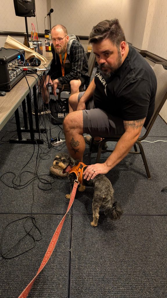 Salsa with friends! Credit: Kevin StillmanAfter that it was time for Salsa to take a nap and me to get dinner. I had a mediocre burger from the hotel restaurant, then we rolled into the Badcast Live Taping. The two of us grabbed a seat next to Fowler, and…promptly fell asleep.