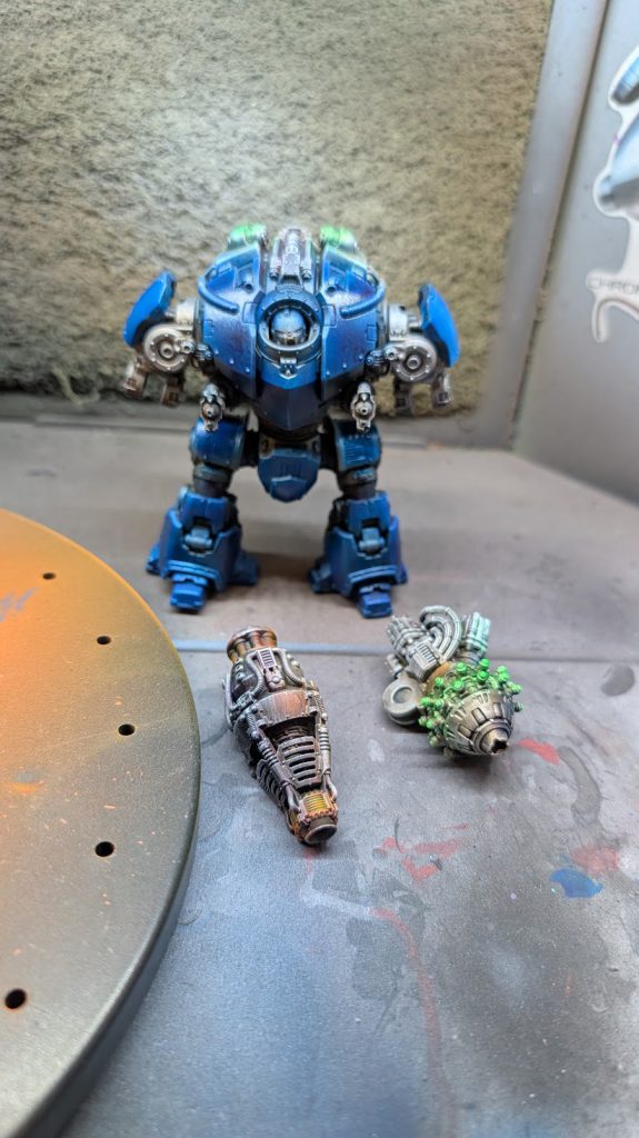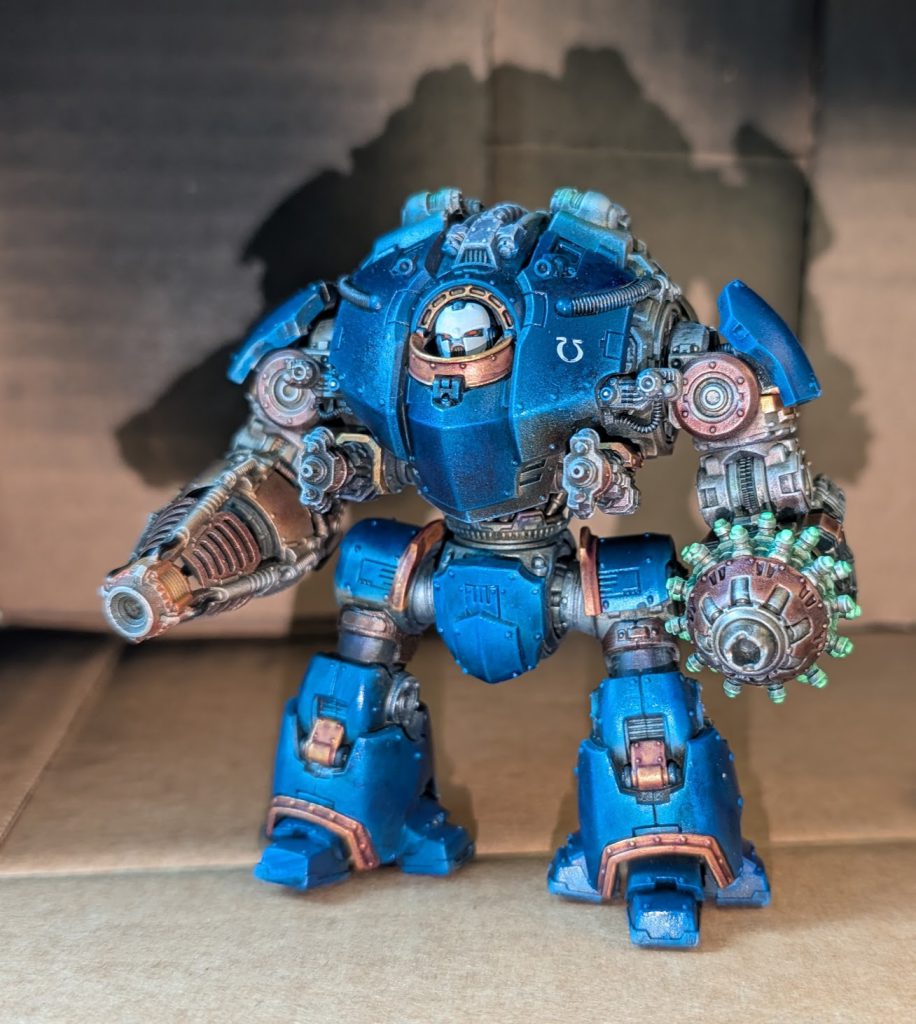 Painting the Dreadnought on Saturday-Monday was my main preparations at NoVa for the LVO, After all, a Knight is mostly just kind of an upscaled Dreadnought. My technique was to paint the black-primed model with Snakebite Leather, before drybrushing it with a bronze, tin, and ultimately a silver to give an aged metal look. Once I got to the airbrush, I then airbrushed on snakebite leather, a purple contrast, and a blue contrast to add some heat and weight stress to the metal before giving it another silver drybrush. I then airbrushed Army Painter Speedpaint Magic Blue onto the sections of the model that I wanted to be blue, in order to match my metallic Heresy Ultramarines.