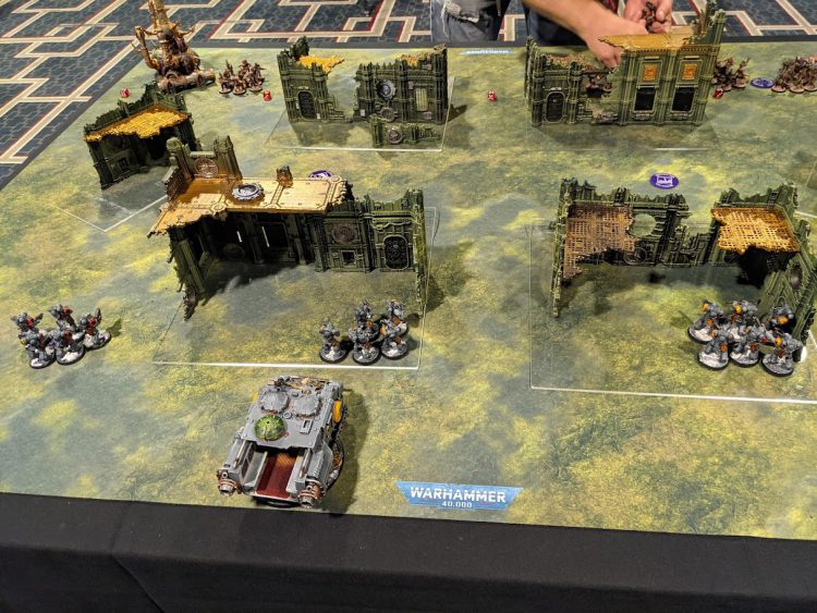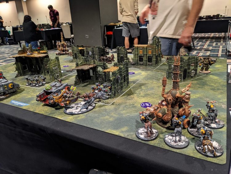 So, if you read Rob's Day 1 recap, you can surmise that I had most of the same problems with the mission as he did: The terrain layout left three big firing lanes, and not really enough terrain to actually hide all of my heavier units behind. I could pop my infantry into the ruins to hold my objectives, but my opponent had a lot of Skitarii. I did not get tabled in this game, but after losing the first turn roll-off and getting my Redemptor wiped turn 1, I just did not have the firepower to hold off two units of 3 Ironstriders.
