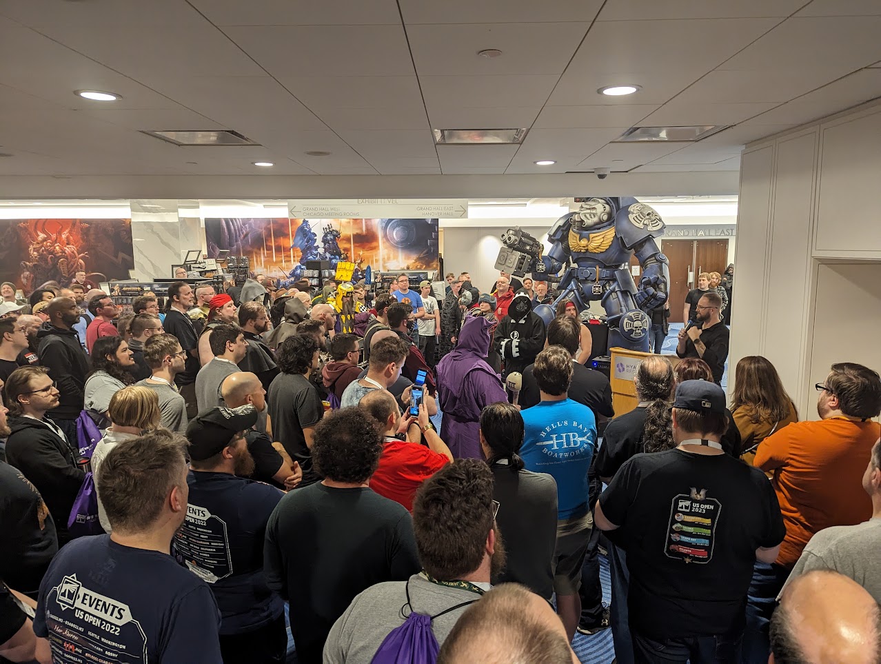 This is only slightly higher than my usual perspective.Spirits were high as we milled about waiting for something to happen by the Terminator. The lead coordinator, a friendly guy named Josh, stood at a podium and started to introduce everyone. At least that's what I think he was doing; in what would become an obnoxious trend for the event the address system they used was pretty terrible and I could barely hear anything. The room coordinators and major players were introduced leading each faction. The Path of Enlightenment was lead by an Inquisitor with wonderful head tattoos (when you're 6'9" you notice these things). The Path of Resistance was led by a Definitely Not Evil charismatic lady who talked of freedom and free beer (that's what I chose to hear, as I said the audio was challenging). The Path of Annihilation was led by Chris Stover, who was part of the team running the NOVA Open narrative and is an all around swell guy. All of them were having a great time but Chris was by far the most fun to watch. This is not to discount the work that Fred (Pact of Enlightenment) and Elle (Pact of Resistance) did. Everyone was fantastic. I will fully admit that I hadn't paid the most attention to the provided lore material and was coming into things cold. Apparently there was a planet, there was something on it that was important, and we were fighting over it. Good enough for me.
