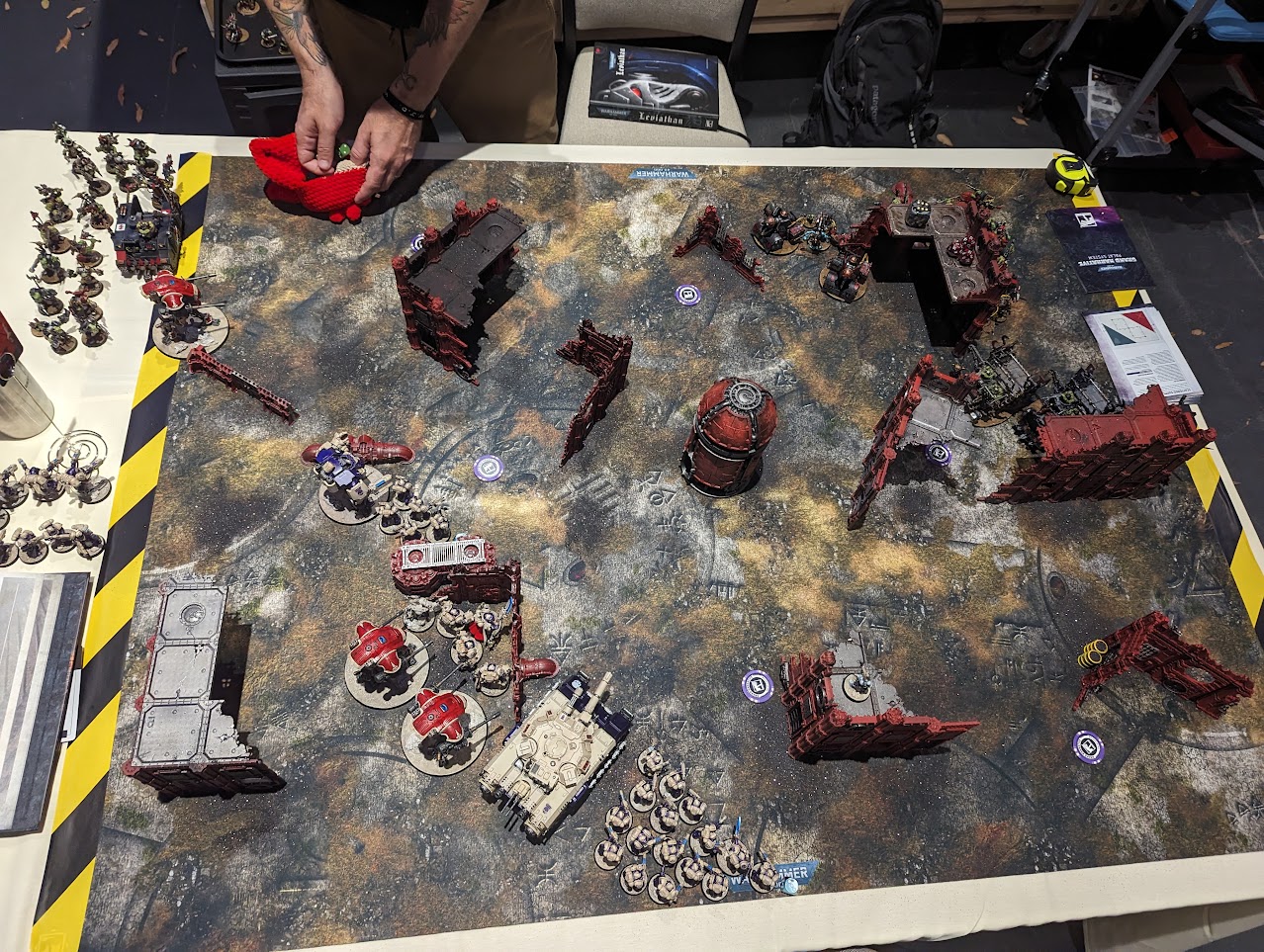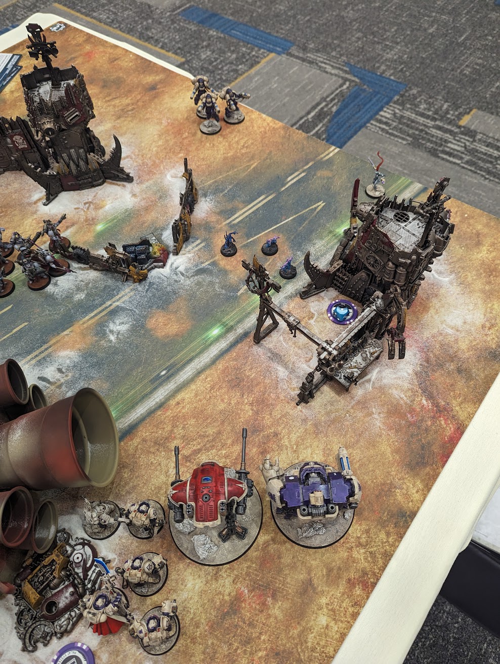 Game 3 against Jon of The Hobby Collab. Jon's army was gorgeous and he was an excellent opponent.Jon is an amazing opponent and is a content creator for The Hobby Collab, which is a fantastic channel you should definitely check out. I don't think it's possible to convey exactly how awesome an opponent Jon is. His army is gorgeous, his attitude is fantastic, and he's damn good at playing his army. I was on the defensive, trying to prevent his forces from burning too many objective markers. Jon's army was well suited with this, with a combination of nasty threat units which had to be dealt with and cultists to do the actual work. I'm not super familiar with Tzeentch but his army features two massive beasts which I immediately knew needed to die, a large block of Terminators that needed to be exterminated, and several sorcerers that needed to be assassinated.