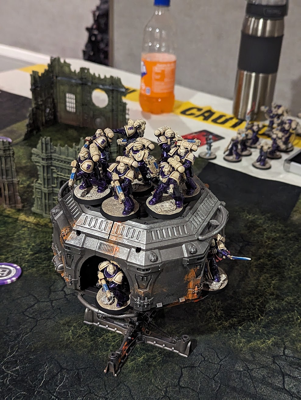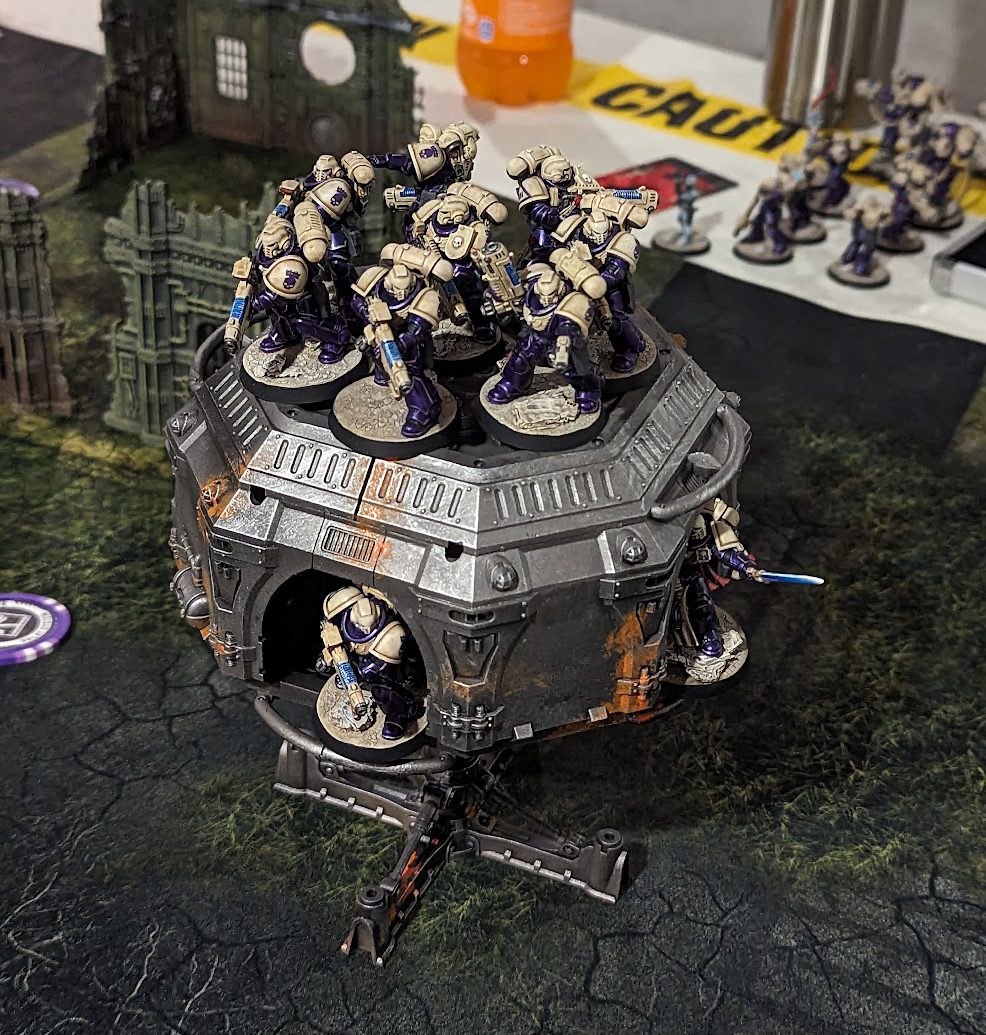 Here lies the cowardly Redemptor Dreadnought, felled by a perfectly guided pistol round to the eye slit after failing to overcharge his main gun.The Land Raider detonated under concentrated firepower while the Sword Brethren inside charged and died to Overwatch and a Primaris Lieutenant. The Redemptor died to a single pistol shot, a fitting end for a coward. My Callidus appeared from the shadows and killed Corbin's Warlord before being overwhelmed with power fists and bolter fire. Without warning the Vox Localum wandered over and casually dropped a D6 on the table, representing an orbital bombardment from the overhead ship. It failed to hit anyone but the mechanic was cool, and it landed closer to Corbin's forces than mine so clearly the Emperor was on my side.