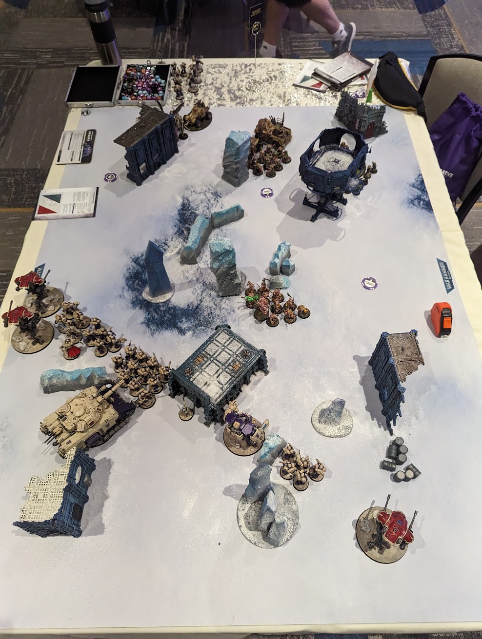 Sure I lost the battle, but the Sons of Magnus paid dearly for it.Game four had me going to the ice biome and facing Jordan from SLAM SECTOR with Genestealer Cultists. I was on the attack this time while my secondary objective was to hold my deployment zone. I immediately felt bad for Jordan because this was roughly the worst possible situation for his army. In contrast to previous tables, the ice one was sparsely covered with very little in the way of site blockers. In hindsight I wish we had taken the time to reposition the terrain so that the ruins were positioned in the middle and formed a natural barrier, because the combination of Anvil Siege Force bonuses, heavy weapons, and long range made this game a turkey shoot.
