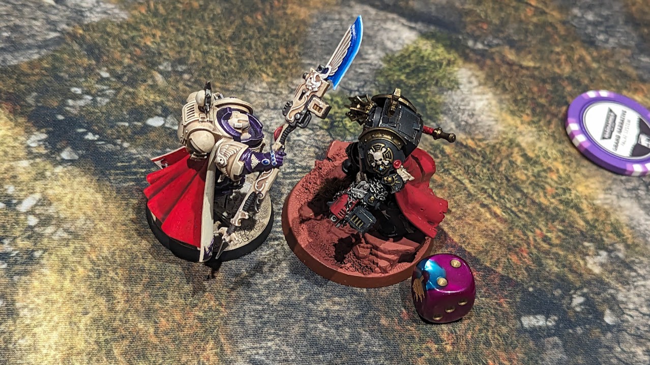 Overwhelmed with rage at the thought of another trusted servant of the Emperor turning to heresy, the Black Termplar leader faces Chapter Master Ominus in glorious combat. Ominus falls, but the distraction provides a critical advantage.My final opponent, and what would become the best game in a weekend full of amazing experiences, was against Corbin and his Black Templars. It's a shame to see such a noble scion of the Emperor fall to heresy, but these are dark times. Chris wandered by and encouraged our leaders to fight for glory in the center of our table, and being cheerful sports who know the Emperor is with them we agreed. My Warlord fell, and the cowardly Black Templar chaplain teleported away before I could shoot him with a heavy laser destroyer. Thus began what would be the highlight of my weekend, which got even better when Mike from our Discord brought me a beer. Thanks Mike! Inspired by this generosity, I put a drink ticket in the middle of the battlefield for us to fight over. Corbin and I agreed that the stakes couldn't be higher.