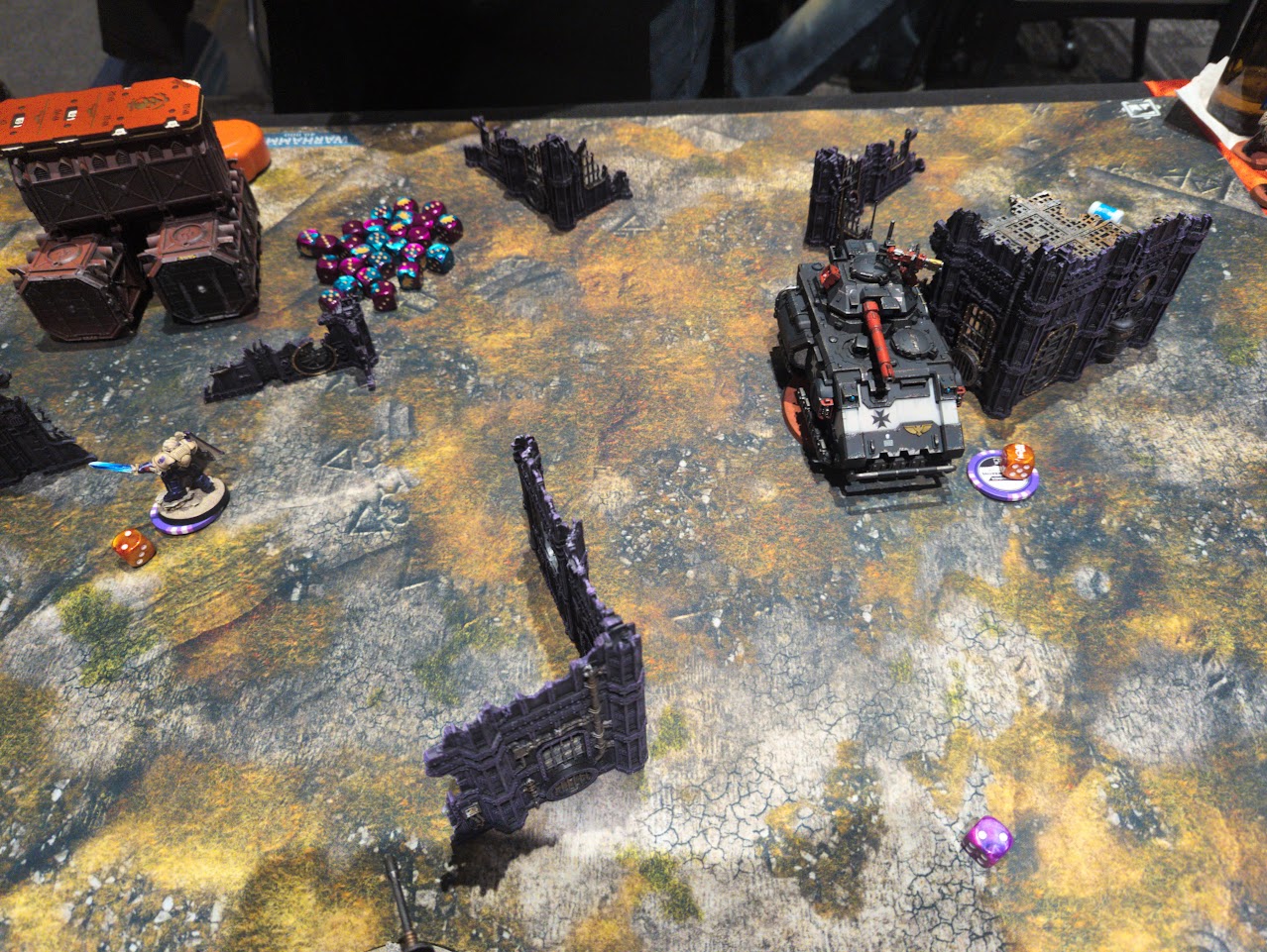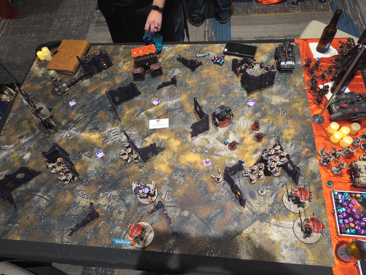 This game was brutal. In a single turn Andrew's primary block of infantry was annihilated, and aside from losing my Repulsor Executioner my force was mostly intact. In spite of all of this Andrew remained in very high spirits, but I could tell that this was wearing on him. It's simply not fun to bring a narrative army to a table where the environment is going to make it impossible to have much agency. Andrew conceded on Turn 2 when it was clear he didn't have much of an army left to fight, and after reporting our results I asked the Vox Localum to note how amazing a sportsman Andrew was in case GW was doing awards or in some way would recognize it. In response the coordinator got Andrew's entire group together, commended him for being such a great player, and gave him a full deck of the Tarot cards. Andrew definitely deserved it, and I really appreciate the Vox Localum for doing it.