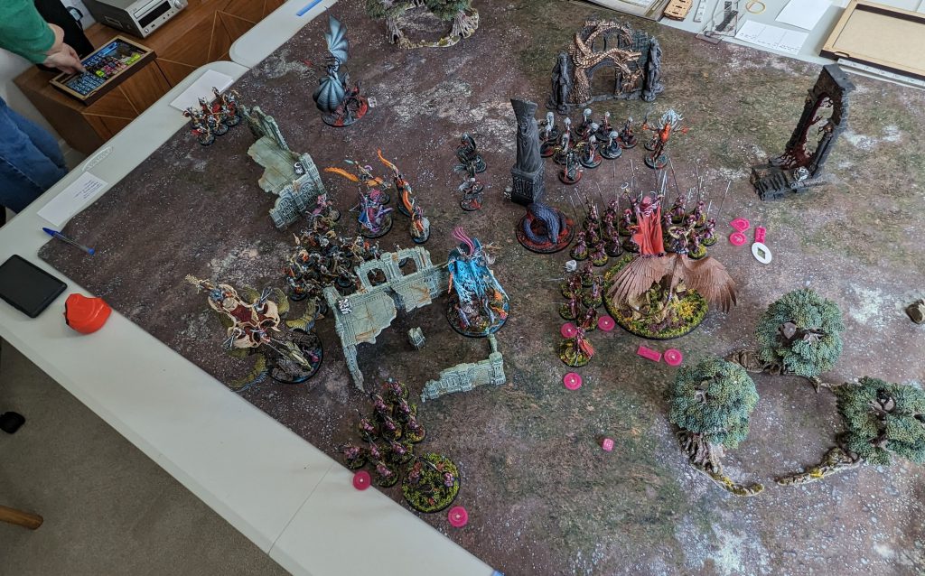 In April I finished: no models. Couldn't tell you why, 8 months out. I do tend to get periods where my brain would rather escape into video games or doomscrolling rather than painting, so we'll put it down to that. I did build a ton of Sorcerer Kings for Conquest, and looking back through my photos I am reliably informed that I got excited by the new T'au book, bought a load of battlesuits, spent ages posing them, did a great airbrush paintjob, then fucked them completely with a combo of varnish and oils. Bummer.I did get a couple of fun games in this month though. With the end of third edition AoS on the horizon, I got together with pod co-host Matthew and pod sometimes-guest Chris for a three-way game of Triumph and Treachery, the multiplayer game mode from one of the campaign books. My Lumineth, Matthew's Idoneth, and Chris' Daughters of Khaine all stood in a triangle, pointing at each other. Looks like we got ourselves a good ol' fashioned elf-off.