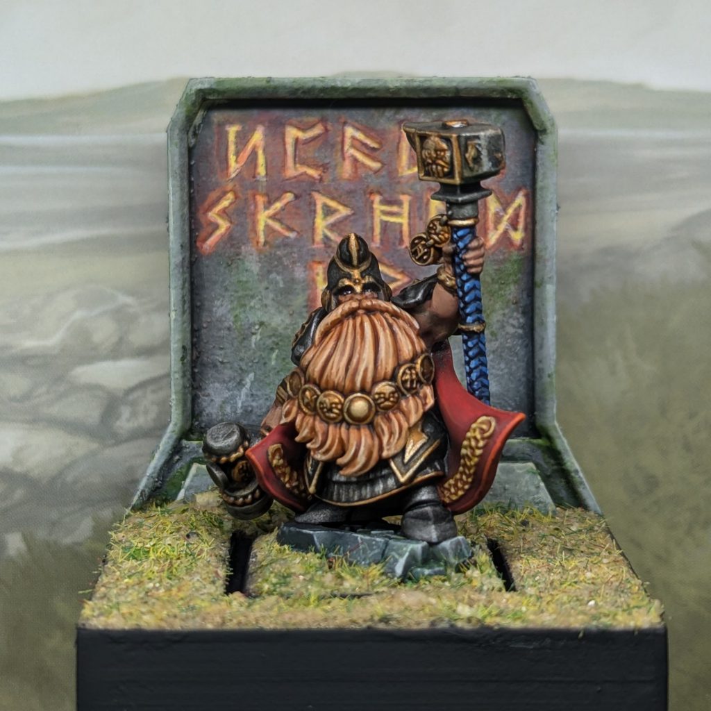 Ogre Boomers for Kings of War (WGA Landsknecht Ogres). Credit: Rich NutterAlso in secret I was working on a Rollmodels secret santa gift. I was thrilled to have drawn Bair as my recipient because honestly I can't say enough nice things about him - this year I feel he's grown from a friendly acquaintance into a firm friend who is generous with his time, thought, and experience. It was great to lavish some attention on painting a model for him, and I opted for a Dwarf Runesmith to support his Old World army. I 3d-sculpted and printed the runestone/plinth and magnetised him in. In tribute to Bair, the Khazalid runes translate to "Never Scroll Up" because, well, he doesn't.