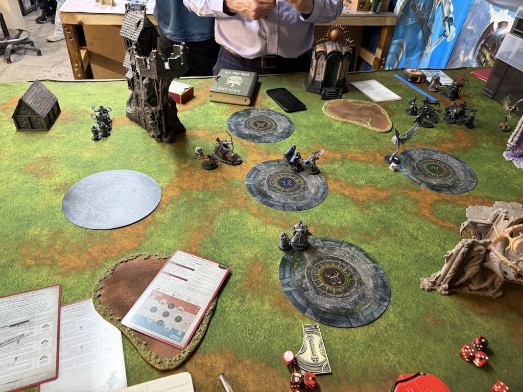 The Prosecutors strike. Credit: Rich NutterStu won turn 2 priority and did some tactical retreating, and some summoning, but didn’t manage to pick up many more points. I managed to pick up the remaining Blood Knights, getting an Intercept target in the bag. I still held Stu’s objective, scoring me the Strike for Restless Energy as well as a bevy of VPs. The Celestant-Prime engaged the Wight Lord while the Terminos and Reclusians took on the Barrow Knights, leading to a fun moment of trying to work out the least problematic order of combats (with the Terminos and Wight Lord both being able to drag their adjacent units with them). Ultimately the Terminos and Reclusians went first, and took enough of a chunk out of the Knights to minimise their clap back. The Prime survived the Wight Lord’s strikes and promptly percussed him back to the grave with Ghal Maraz.