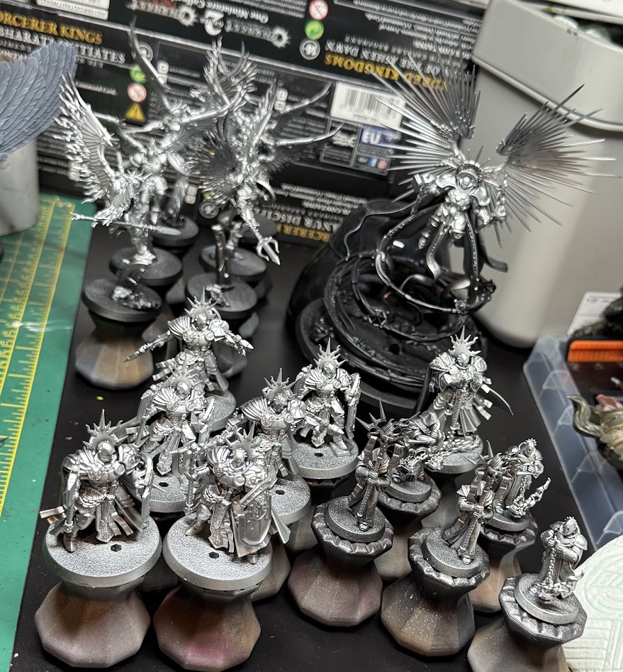Stormcast based in silver, soon to be inducted into the Hallowed Knights. Credit: Rich NutterBack on the good stuff though, I did make some AoS progress. I got everything I need for my AoS list built and primed, and I airbrushed on the silver for the armour colour. I then made a bit more progress on Iridan the Witness, basing and drybrushing their mount.