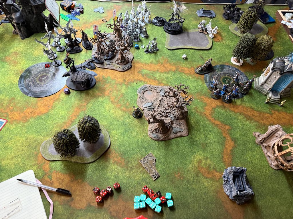 The Liferoots ends up being mostly an end-to-end game due to the deployment zones and paired objectives, but the small bands of neutral territory meant that Stu was able to pincer my deployment between two Cursed Sepulchres, putting me at risk of attack from all sides. Having won priority I did give Stu first turn, trusting that I’d deployed far back enough to make a turn 1 charge at least unappealing. This was the case, and he chose to play it safe and hold the middle of the board to score his Affray for Attuned to Ghyran. I did make one reasonably big mistake here, using Magical Intervention to cast the Soulscream Bridge as a screening piece in front of my main line. This is sometimes a great surprise tactic, but in hindsight Stu wasn’t really far enough forward to make the charges a big threat and if anything the bridge just offered him a shorter charge (which he thankfully didn’t take). Fortunately the Stormcoven managed to banish it in my Hero Phase, meaning I didn’t completely ruin my first lot of movement.
