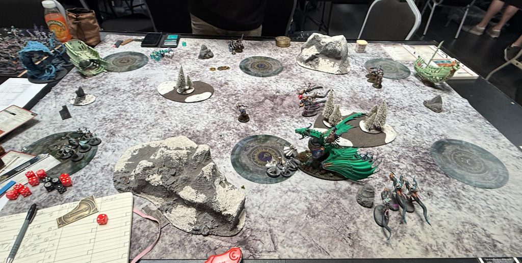 This was my first time facing Idoneth since their book release, and also my first time playing Chris. Of note, at the time of playing I didn’t have the code for the book and couldn’t check something, which meant I made a stupid mistake.Chris’ list wants to hover around the edges of the board to make the most of a -1 to hit debuff. Mathaela has a pretty scary spell that they can use to do big damage to monsters, and the tides are there to make everything more effective.