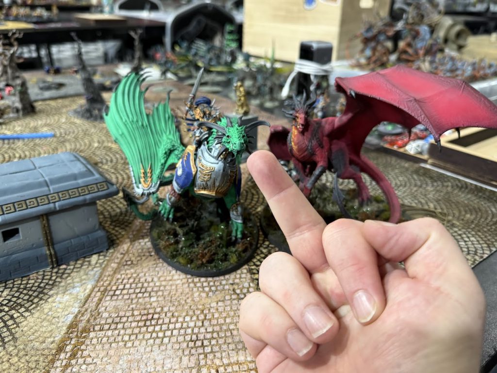 Facing down the rabid hordes. Credit: Rich NutterAlex outdrops me and gives me the first turn, which I don’t hugely want. Karazai shuffles into the middle, while the Stardrake heads for the right flank where Ushoran is deployed. I drop all of my shooting and bring it to bear on Ush, but he lives on a heartbreaking 1 wound! In Alex’s turn a heal and a big Rally roll bring him back up to 8 wounds or so. He also gets off his warscroll spell to make Karazai attack the Longstrikes that are foolishly in his combat range, eating half of the unit. Alex lines up a whole bunch of charges on the Stardrake but it makes a big Redeploy to limit the engagement and lives. The Stardrake both eats 2 Morbheg Knights with its rampage and pops its artifact and fights first, eating Ushoran.