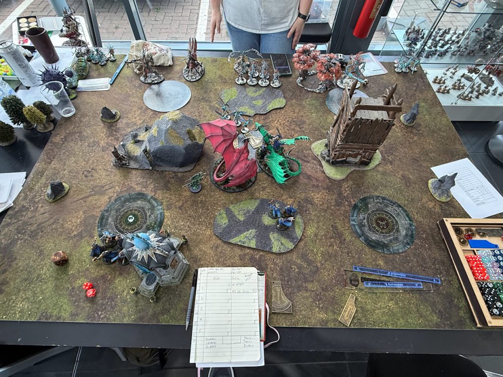 Chasing around those tricksy Sylvaneth. Credit: Rich NutterOne minor point of contention. I was mistaken in thinking that Drycha had the Infantry keyword rather than Monster and thus benefited from Obscuring. My memory is that I checked this with Tom, he looked a bit unsure, checked his phone, and said “oh yes, Infantry”. If that’s genuinely how it happened then that obviously sucks, she was an Intercept target for me and I ultimately spent most of the game thinking I couldn’t have gotten to her with my shooting. In Tom’s defence, maybe I was too forceful in my assumption and he was agreeing with me or assuming I knew more, or maybe I misheard him. Tom was otherwise a lovely and personable opponent, so I do hope it was my error and not outright cheating. It might not have changed the game, but the result was close enough that I’m annoyed in hindsight, whoever’s fault it is (mine, probably).