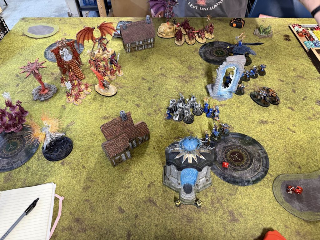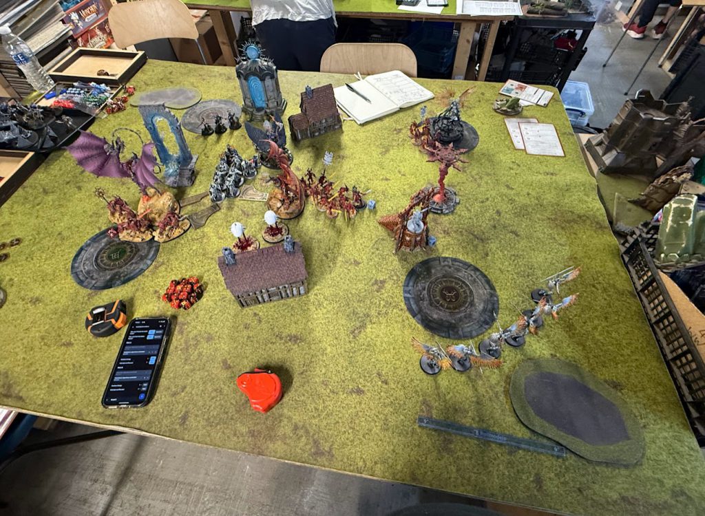 Deployment vs Rich A. Credit: Rich NutterRich A was running the new Blades of Khorne battletome with the Murderhost formation to get extra moves with his Daemon units at the end of his turn. He was running a pair of Bloodthirsters, a couple of units of Bloodletters with the hero, a Slaughterpriest, 6 Bloodcrushers, 10 Blood Warriors, and 10 Bloodreavers. Rich won the priority roll but knew I’d outdrop him, so made me place units first. Fully deployed, I gave him the first turn.