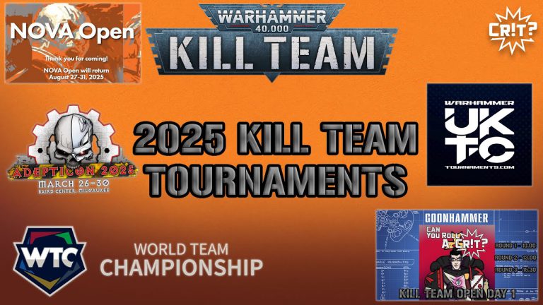 John from Can You Roll a Crit? is back with a new video going over the major tournaments coming up for Kill Team! He goes over the Goonhammer Open UK events he is running as well as tons of major Kill Team events in the UK and USA!