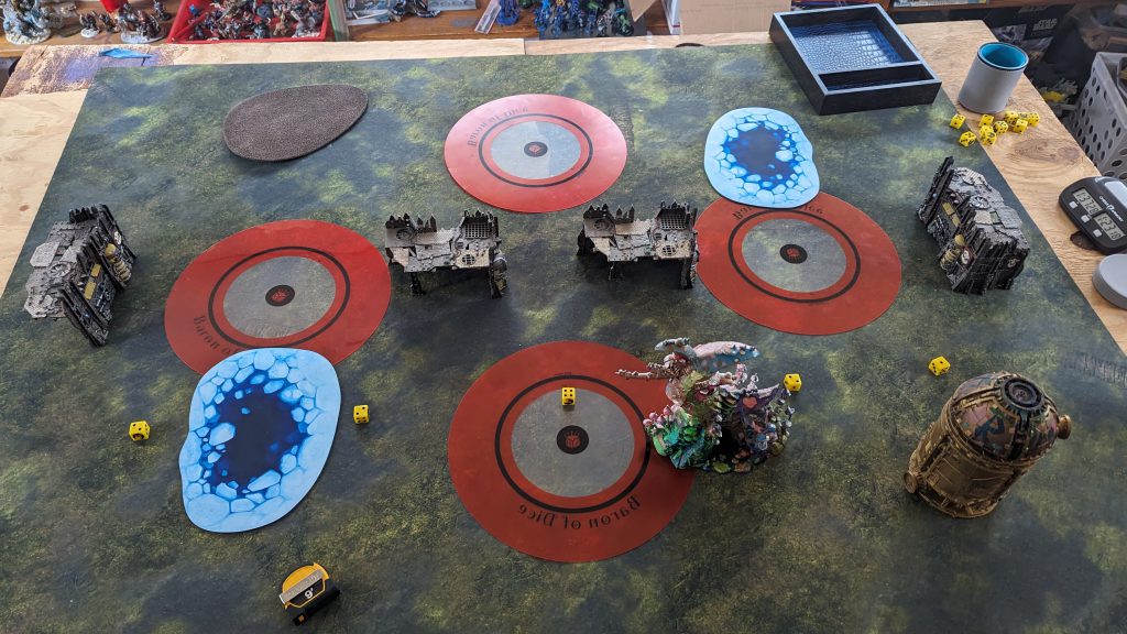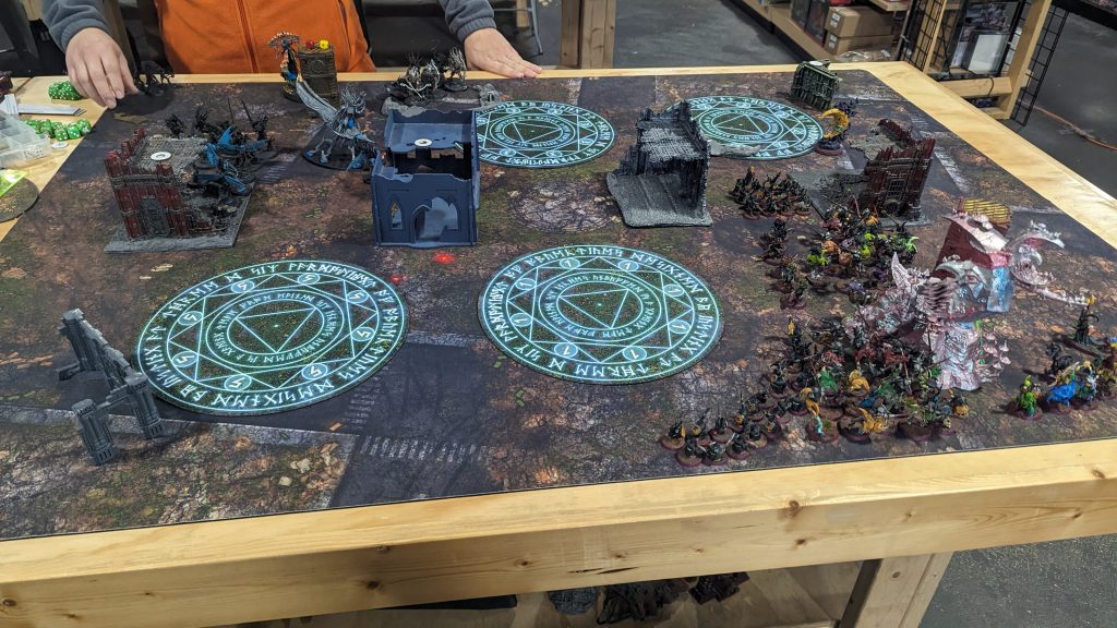 Playing Sylvaneth on this map is such a weird experience because they bounce away so quickly. This was one of the first times I tried casting my spells with the 'poolza (Lower right) before teleporting them into the screening position.I've been playing around with "Stab them in the dark" as a tactic that requires a unit not affected by the bad moon destroying a picked enemy unit. Early rounds of the game make first charges unreliable into units as most players have a lot of command points and the ability to redeploy without giving up anything. In later rounds, when a unit has been damaged or an opponent knows they need command points to all out defense, all out attack, pass bravery, or do some wonky faction specific abilities they're less likely to redeploy.