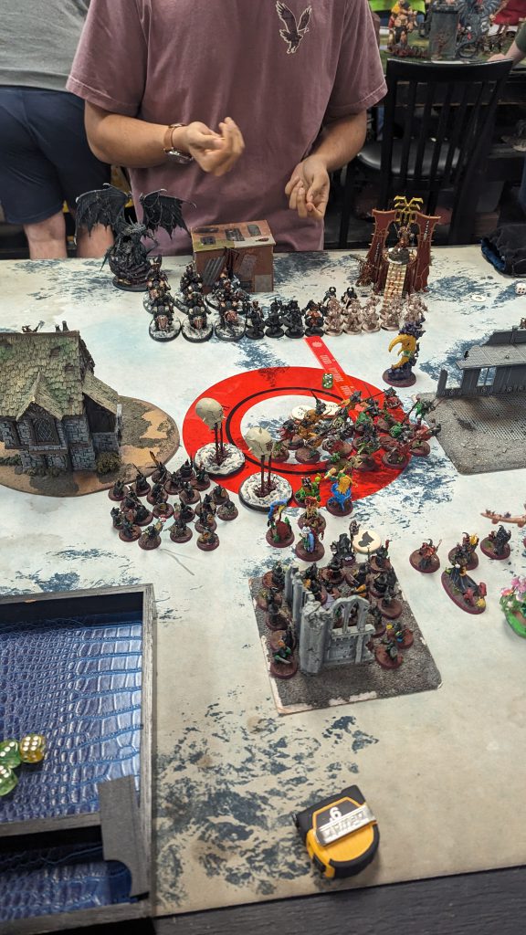 The combination of dark master and a 3D6 charging Skarbrand led to me losing my loonshrine in this test game. A few improvable things happened. First, the Khorne player was unable to do a single damage to a loonsmasha so I couldn't bring it back as a screen and I failed a rerolled 7" charge. This kind of thing happens all the time in events and I like playing through "improbable" events when I get the chance.Issue: Tactics are really different from my other lists