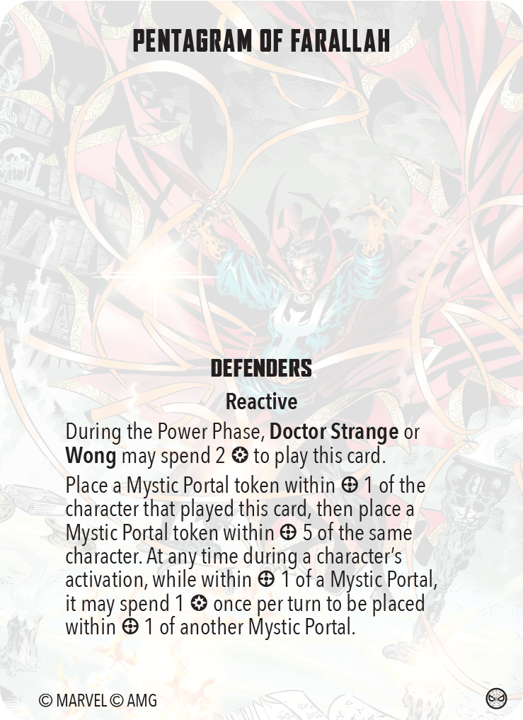 From https://www.atomicmassgames.com/The original Defenders card, Pentagrams allows Dr. Strange (not the Sorcerer Supreme) or Wong may place two tokens that allows for three power that allows any model (enemies included) to teleport between the two for a cost of one power.