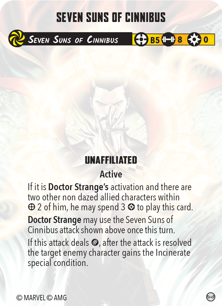From https://www.atomicmassgames.com/Another Dr. Strange card. Yet again, two allied characters must be within range two. An annoying requirement. Still, on a central fight, having access to a range five beam that throws eight dice for the cost of only three power is good. The fact that you can incinerate a bunch of the enemy team is also great. I’ve had games where I never get to use the card because allies keep getting dazed, pushed, or thrown. I’ve also had games where this attack devastated an enemy team.