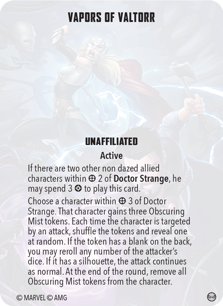 From https://www.atomicmassgames.com/Not strictly a Defenders card, but it is a Dr. Strange card. Vapors gives you the chance to rerolls an enemy’s attack dice against a specific model for a round. But, you need two other models to be close to Dr. Strange. Wong is likely already there. You’ll probably want the target of this card to be close as well, so it’s not the worst condition, but it’s not great either.