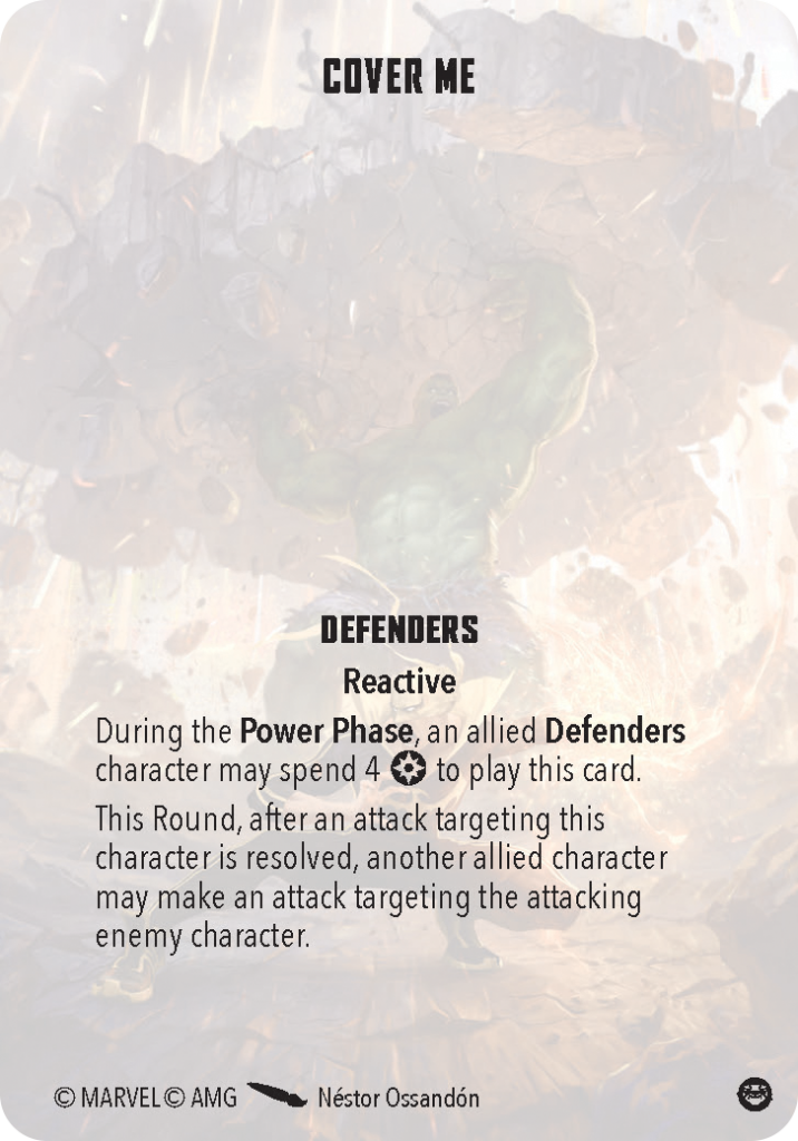 From https://www.atomicmassgames.com/The first of our new Defenders specific cards. Cover Me allows one Defenders character to spend four power. After an attack is resolved against the character, another allied character may respond with an attack.