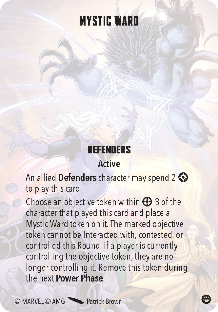 A second use for Mystic Ward is to use it early in a round, on an objective that is in its original placement or one that has been dropped. If you can’t get to it, and your opponent is lined up to pick it up with a slippery model (Black Cat, for instance) you can deny their ability to pick up the objective and run away with it.