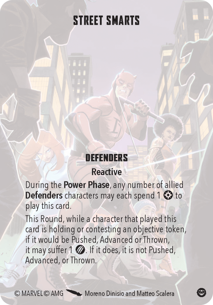 From https://www.atomicmassgames.com/Street Smarts is the final card. Any number of Defenders characters can spend one power. For the rest of the round, if a character who spent one power would be pushed, advanced, or thrown, they can take one wound to stay where they are. While the prospect of taking wounds is certainly less than ideal, being able to stay on a secure objective or stop a big model (Hulk) from being thrown into a friendly model is phenomenal.