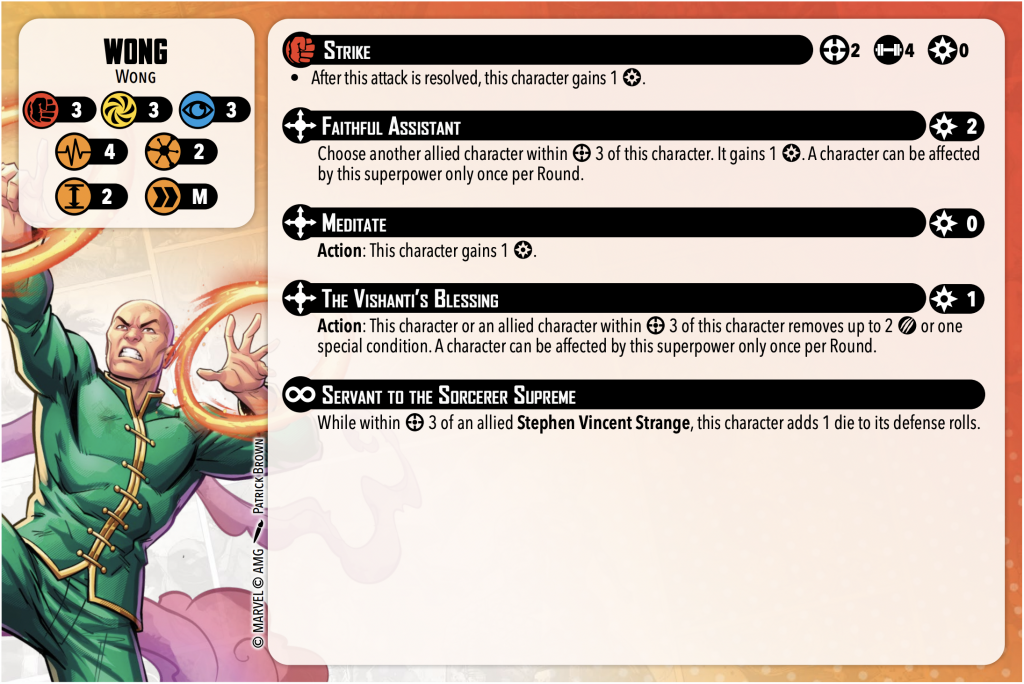 Wong is quite strong in Midnight Sons as well. He can provide healing and remove conditions from friendly models while standing on a back objective to score points. Bump in the Night is great for Wong to help him get into range to leverage his. superpowers at a slightly wider range.