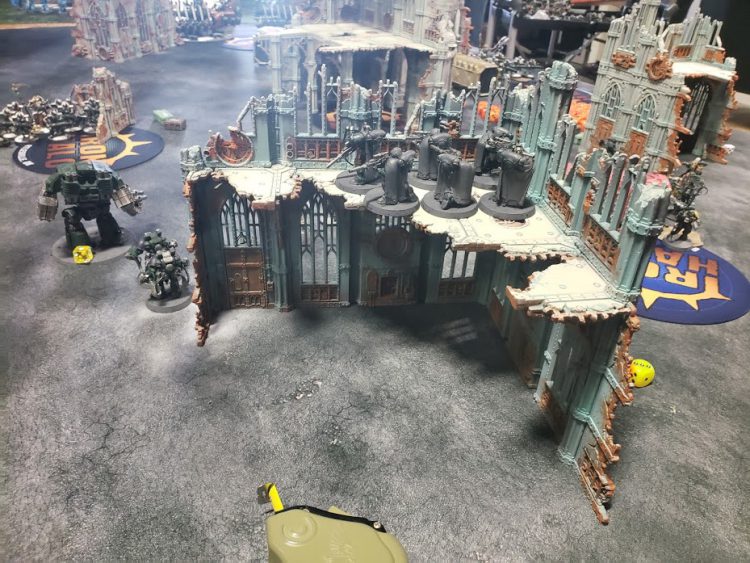 In his shooting phase, he put two Doomsday Arcs into my Executioner, killing it. This in turn caused my angry Aggressors to jump out towards the N objective. On the other side, the remaining Doom Scythe his other Doomsday Arc put shots into the wounded Leviathan, only to do nothing to it. Then that was it. That was the turn. I had Aggressors standing out in the open, and both Leviathans still up.