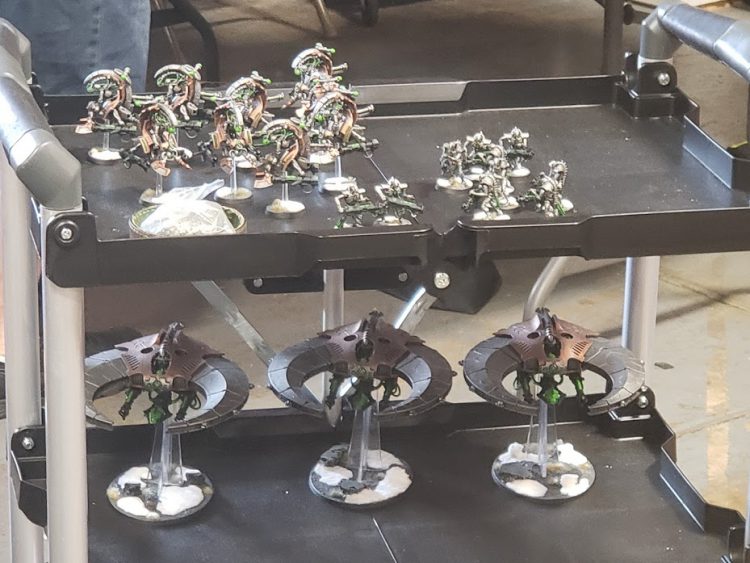 One of my Warhog teammates is Cody "The Lich" Boe, affectionately called so since he has been playing Necrons for the past uh... Decade? 300 years? Who knows. Death Robots are weird and they just keep coming back. Thanks to games I've played against him, I already had a great game plan against Necrons before we even started setting up. I've found the majority of Necron lists are relatively the same, heavily leaning into the best parts of the book with a couple of small adjustments. Boe has great luck with the durability of Wraiths, whereas other people find their success with the shooting that comes from Tomb Blades. I planned to focus on knocking out the planes and owning the middle of the table to the best I could.