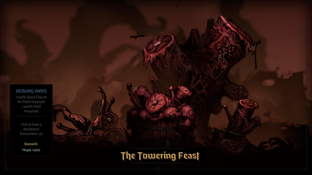 The way this works is that you can come across a Shrine of Heroism location in any possible node in any biome you’re wandering through, same as any other kind of location. If you roll a Shrine, instead of a room fight or a merchant or a relationship choice, you’ll be presented with the opportunity to see one of the five segments that defines every character’s backstory. Generally speaking, three of these segments are very simple: the Academic relates a portion of the character’s sad, benighted past, and you click the Continue button. Two out of the five times, though, you’ll be thrown into a flashback “fight” that will have boutique goals and enemies and only operate remotely on the same logic as the rest of the game’s combats. Sometimes it’s tedious but an amusing high concept, like the Jester fight that’s actually a musical duel with your mentor. Sometimes it’s tedious but tasteless, like the domestic violence minigame in the Grave Robber’s backstory progression. Most of the time, though, it’s just tedious, like the first time you have a flashback with the Runaway, the great new character class that’s been added to the game: