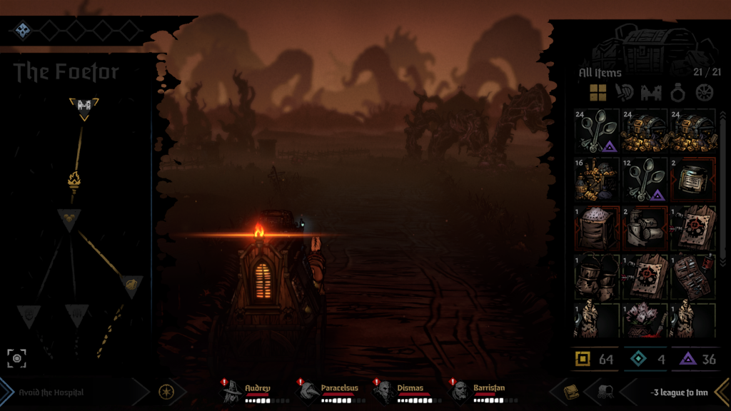 We’ll get to what I mean precisely by that in a bit. First, the good things: despite the game moving to 3D, the visual feel of the franchise remains intact and has arguably thrived. Darkest Dungeon II is a game that can’t be in two dimensions thanks to the addition of the stagecoach mechanic (reasonable disagreements can be had with regards to the wisdom of that mechanic itself), and so it had to taken the hand-drawn indie comics look of the first title and translate it into a world with meshes and a lighting engine and so on. This is almost an unqualified success; the animations look great, the lighting doesn’t interfere with the high-contrast, heavy-inks art style, and there’s a charming paper-mache diorama feel to a bunch of the environments as you cruise through them, especially The Sprawl, a biome that represents a burning cobblestoned city.