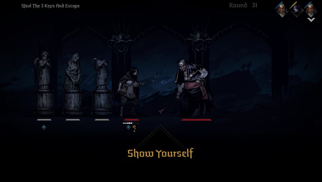 The way this works is the Runaway starts in position four, has to advance to position one, and use the special skill to steal a key off the nun. Meanwhile the nun targets two positions (the positions themselves, not the “characters” in them of the Runaway or the columns) at random and attacks them. I’ve played optimally. You’ll note I’ve had to steal the key three times. That’s a cool one key every ten rounds, assuming you figure out the gimmick immediately -- it’s not like these are tutorialized, and part of the game is trying and failing, like with the domestic abuse fight on Grave Robber that I’ll have to do again at some point (I suppose in the interest of a modicum of fairness, I should note that your drunken, violent husband merely inflicts stress damage on your character instead of HP damage, and you are trying to poison him at the time, due to all the abuse). It’s probably too much to ask that this concept be shoved out the airlock wholesale, but that’s kind of what it deserves. At the very least, I hope to see some quality of life passes to get the time spent in these minigames once you actually do know the rules down to a couple rounds maximum, rather than, oh, thirty-one.