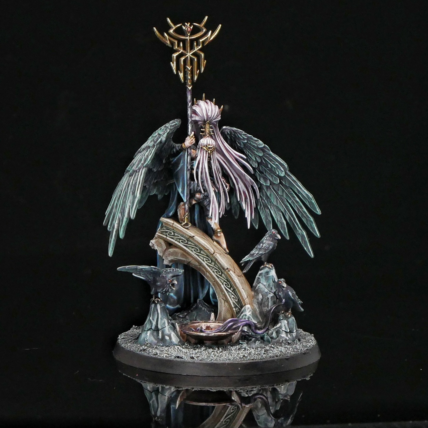 Credit: KeewaKeewa: Krethusa the Croneseer is a very cool new model for the Daughters of Khaine faction, and she’s going to make a fantastic challenge for any painter. The concept is a classic: A creepy lady with crow’s wings atop a piece of broken masonry, with big big big hair and some lovely birds hanging around. I love it; I love everything about it. Now, to be fair, I’m usually opposed to the idea of a model using a piece of hero-rock to stand on since it effectively dictates how you can create the base for a figure, but in this case it’s an absolutely essential aspect, and since the footprint of the model essentially fills the 50mm base she’s similar to an Underworlds figure with a completely sculpted base.