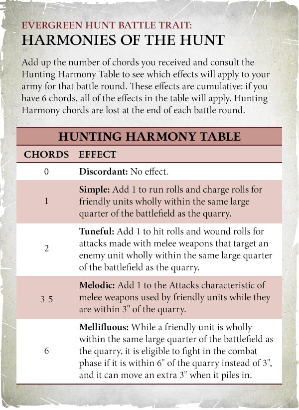 To Honour Kurnoth makes all your non-Hero units battleline, simple enough. This is an elite army and you gotta fill those mandatory slots. Abundant Growth is a modified Places of Power, granting only healing within range of Overgrown terrain but not Awakened Wyldwoods. Although you can still use an Awakened Wyldwood if you wish, you won't be able to summon more during the game without a Wizard..The major mechanic of this army is handled by two rules: Rhythm of the Chase and Harmonies of the Hunt. Rhythm of the Chase simply asks you to pick an enemy unit to be your Quarry after deployment, and you can change it any time the quarry is destroyed. A new heroic action A Prized Quarry is Sighted lets you change your quarry to something else within 9", which can be worth it if your opponent moved the Quarry away or if you want to catch them off guard with another target that is closer. A new monstrous rampage Merciful Strike. It's a bit convoluted but you may pick a quarry you are engaged in combat with, and roll a die. If you roll higher than their wound characteristic, slay a model. You get to add the amount of wounds allocated to the unit to the roll as well, making it pretty good at picking up elite infantry or even a Hero who has taken a few licks.