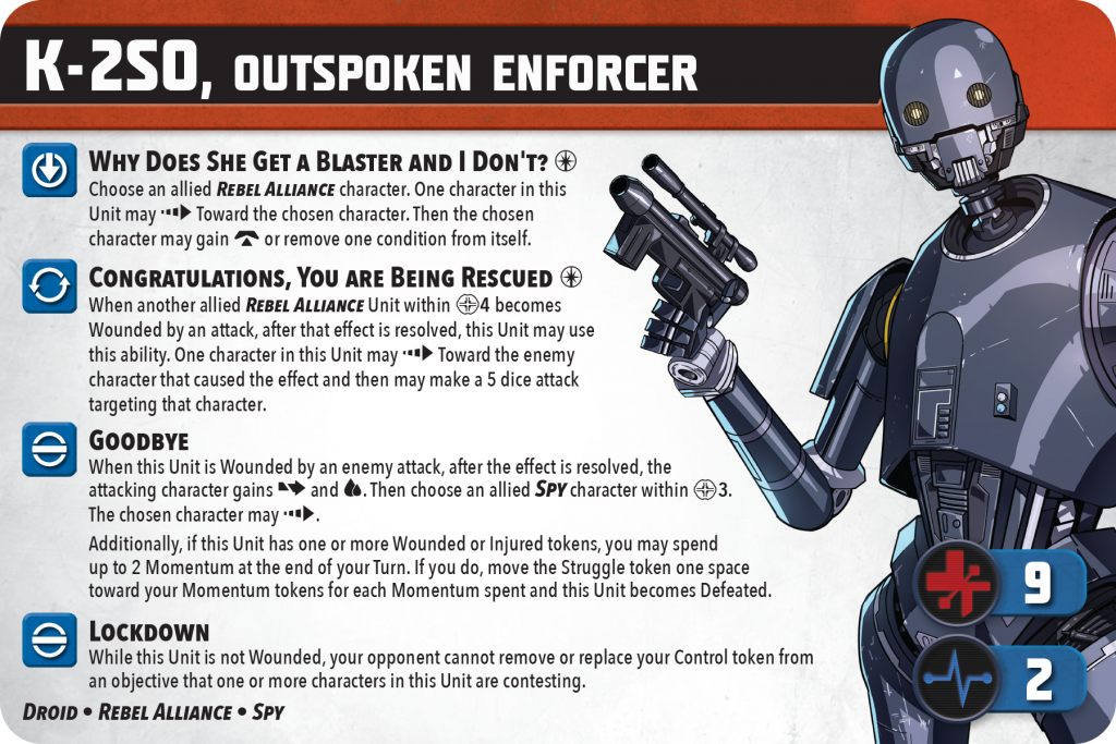 K-2SO comes with four abilities. The first is useful but disappointing, like We Need To Blend In it is over costed compared to similar abilities on other units. Most of the time dashing toward a rebel won’t very restrictive as you have the commandos out front but if you are pairing Cassian with non-rebels it can become restrictive and taking someone like Lobot over K2 is worth considering. Congratulations You are Being Rescued also looks for the rebel tag. It gives you a 5 die attack which is ok but the main purpose is to move K-2 onto one of the points your opponent is looking to flip for the turn. It is worth noting that it has been ruled that Cassian can make K-2 move and than if the wounded unit, not model, is within range 4, K-2 can trigger this can potentially react to a unit 16 inches away being wounded, more if you have a favorable ingress point. Once he gets on the point it is his due to Lockdown even if your opponent has multiple models on elevation and K-2 isn’t. I first learned about Goodbye when I did the standard shoot than move on point order of operations to see where Cassian would react to. After wounding K-2, I was now strained and pinned and unable to move onto either point!
