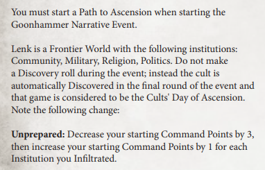 The big thing to note here is that Lenk is a single planet of import for the GSC and you can't let the Day of Ascension happen too soon. So the addendum I made here is to force game 6 to be the Day of Ascension and to make the consequences a bit less brutal, since a player is unlikely to infiltrate more than 2 institutions during 6 games.