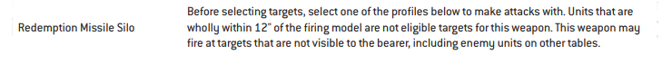 How this works: You choose a target on the next table over - they still have to be in range - and then fire off your shots. At the start of your ally's next shooting phase, those shots all connect.