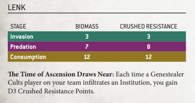 For the Genestealers' sky-gods I needed to take a similar tack for Lenk, but I wanted to try and create some synergy between the two if I end up having players from both. Again, it's unlikely a Tyranids player will be able to take down the planet or even get to stage 3 during the event, but being in Invasion and Predation seems right.