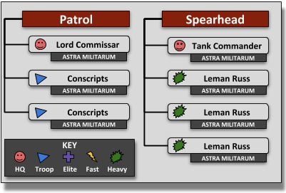 Once all your units are organised into detachments, and those detachments all share a Faction Keyword, congratulations - your army is now Battleforged! Here’s an example of a Battle-forged army made with a collection of detachments.