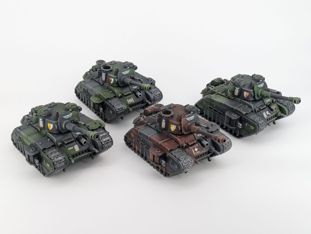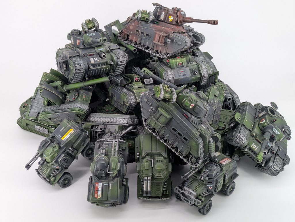 This is the bottom of the spectrum. This is territory where the tanks are supporting cast members instead of the stars of the show. You can also be brave and bring one of the super heavy options. Heck, some lists might not even have any tanks at all. This is typically an army which has a bunch of other things going on, forgoing vehicle hull presence and using infantry or mounted options as the main attractions. Popular low-tank-count lists (that aren’t Guard Recon) would be Grizzled Company lists. These can go a number of directions, with the shooting support often coming from a healthy amount of Tempestus Scions or Kasrkins. You will see far more 20-man Cadian Shock Troop bricks, 5-man Cadian Command Squad + Ogryn body guards or Attilan Roughriders featured here. Ogres of either variety, Ogryn or Bullgryn, are also popular. This list will often have a high count of MSU units that are very useful and expendable. A common take here is two Rogal Dorn Commanders, and then everything else. This creates some very good firebase support where the tanks stand in firing lanes and support the rest of the army. The tanks run by themselves and don’t need to worry about order range since they can just order themselves in this case. You will also see singleton Rogal Dorn Commander variants here that may bring two transports like the Chimera or Taurox for the Dorn to order around. With 2-3 orders depending on the Detachment, it’s a nice bonus to be able to use Move Move Move on those transports full of Kasrkins or other infantry.