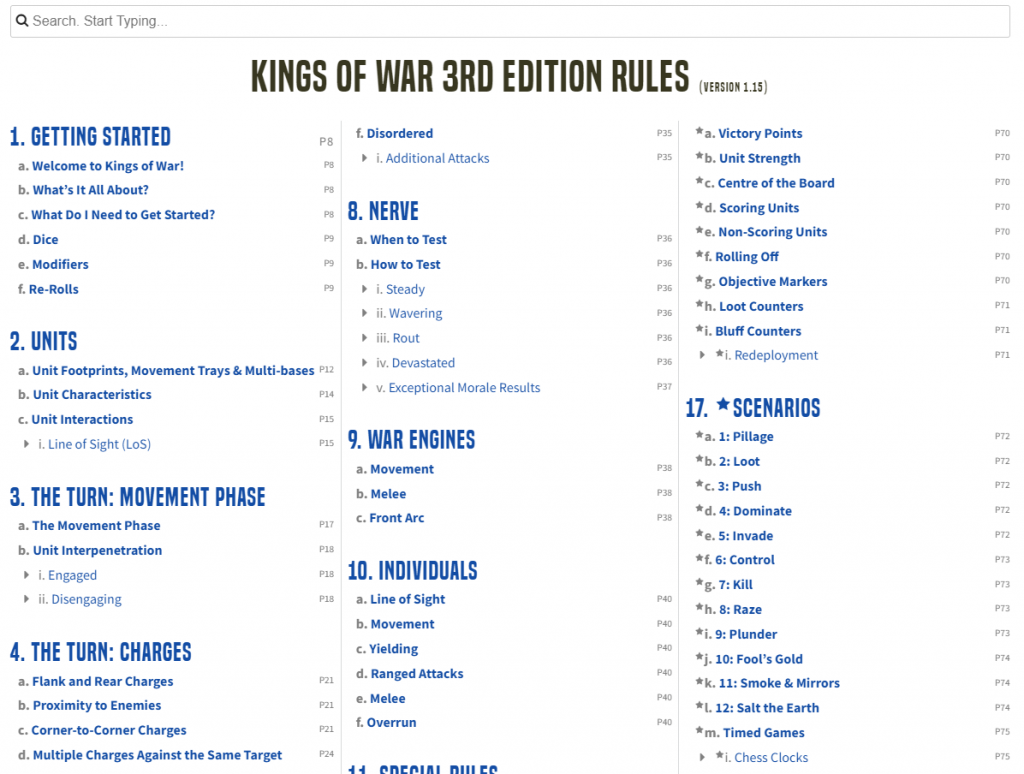 Layout of the Kings of War Rules in the Mantic Companion.Looking just at Kings of War, the contents of the entire ruleset are laid out right down to sub-sections. Interacting with any of these will bring up the relevant section in full detail, which already makes navigating the rules almost seamless by itself.
