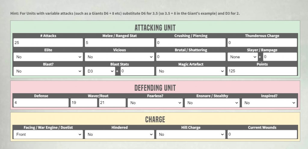 Want to know just how much damage your regiment of knights will do charging into a horde of villein? What about if they are hindered? In the flank? With one item or another? One could always do the maths to check, but now there's an easier way. While the little MathHammer tool in the list builder gives a quick overview, the dedicated tool gives a much more in depth look at how a unit can be expected to perform.