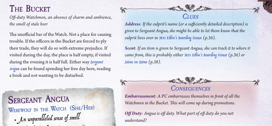 Credit: Modiphius Entertainment. Clues and ConsequencesEach location is laid out with a set of clues and NPCs that can be found there, and some sample consequences tailored specifically to that scene and location. I love all of these for multiple reasons, beyond just making it easier to run the game in the moment. The example consequences give you a lot of guidance for the kinds of things that can be setbacks in the moment, and help a GM figure out what feels right for the different levels of consequences a player can suffer. The NPC trait blocks are great for a similar reason. In the game as it’s being played, they let the GM know what’s up with a character, but outside of the game they serve as a ton of examples of different character traits to help players get around what kind of things they might want to write down when creating their own characters.
