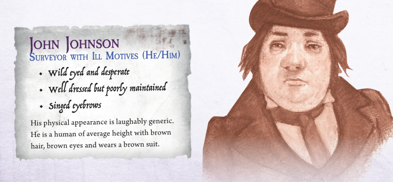 Credit: Modiphius Entertainment. A sample NPC description.The clues, of course, point PCs in… a direction, sometimes right, and sometimes not, but I think their most important contribution to the game is simply existing. When the players know that they can go to a location and learn a thing that will point them to another location or person or whatever, it gives the game a structure to hang on that’s missing when everything is just totally free-form. No matter what, if the players are just racking their brains trying to figure out what they should be doing, they can always fall back on very basic interactions like “looking around” and “rummaging through people’s stuff in case there’s something interesting in there”.