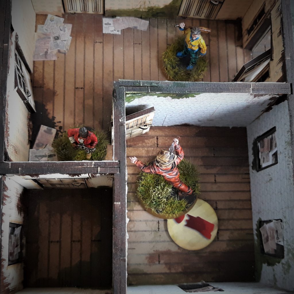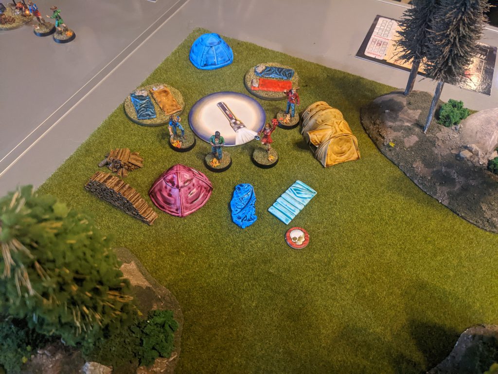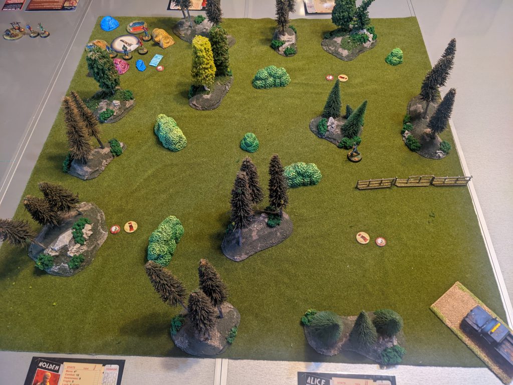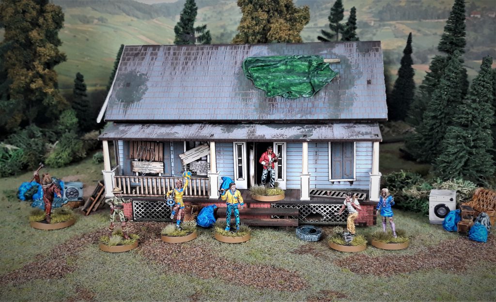 Mugginns (Michael O): I would suggest a bunch of trees with area terrain bases, one or two houses, some outbuildings, fences, walls, etc. A campsite with tents and all that works great too. Each scenario has a suggestion for what to use. If you’ve played modern or zombie stuff you should have enough. If you don’t have any modern buildings Black Site Studio sells the best pre-painted ones on the market, IMO.